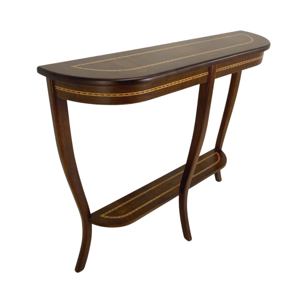 Aparador de passagem, estrutura em madeira maciça de jequitibá, tingida de imbuia. A parte da marchetaria feita com radica natural de imbuia.