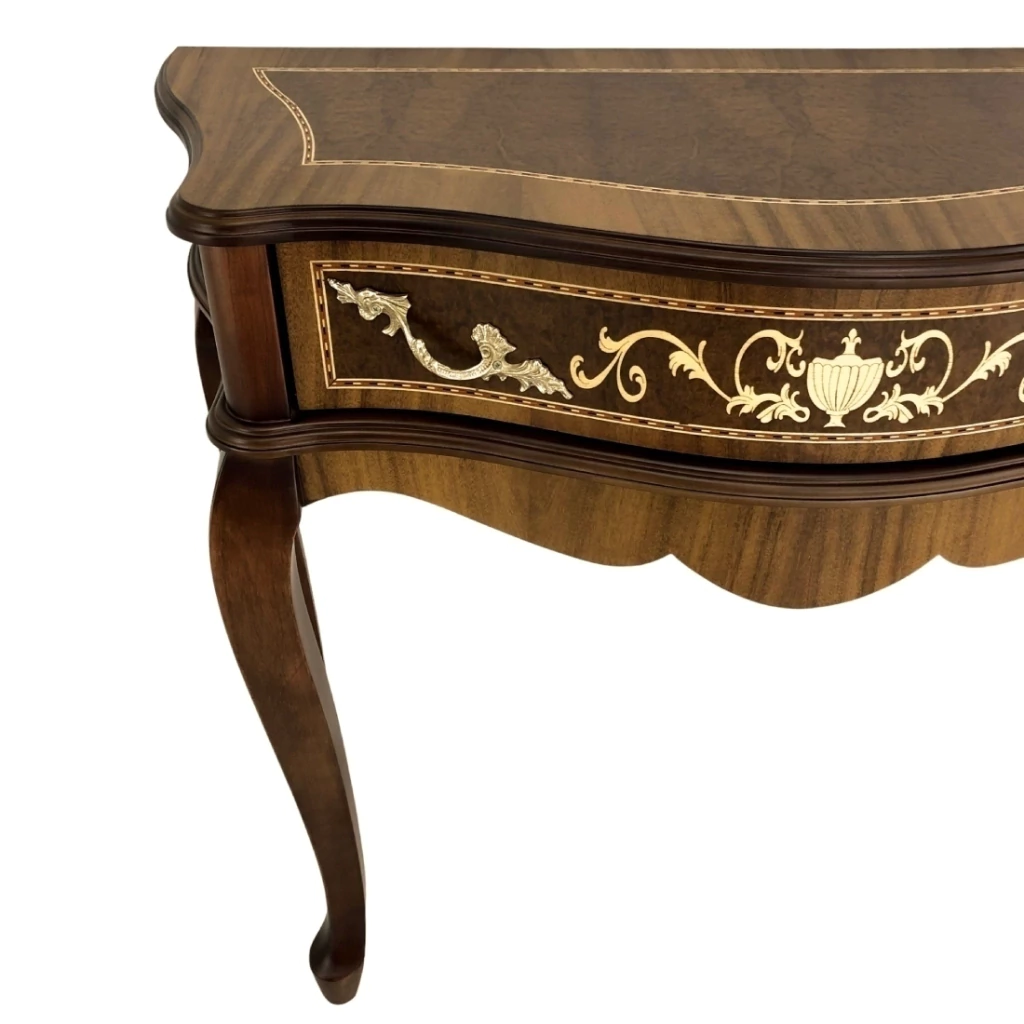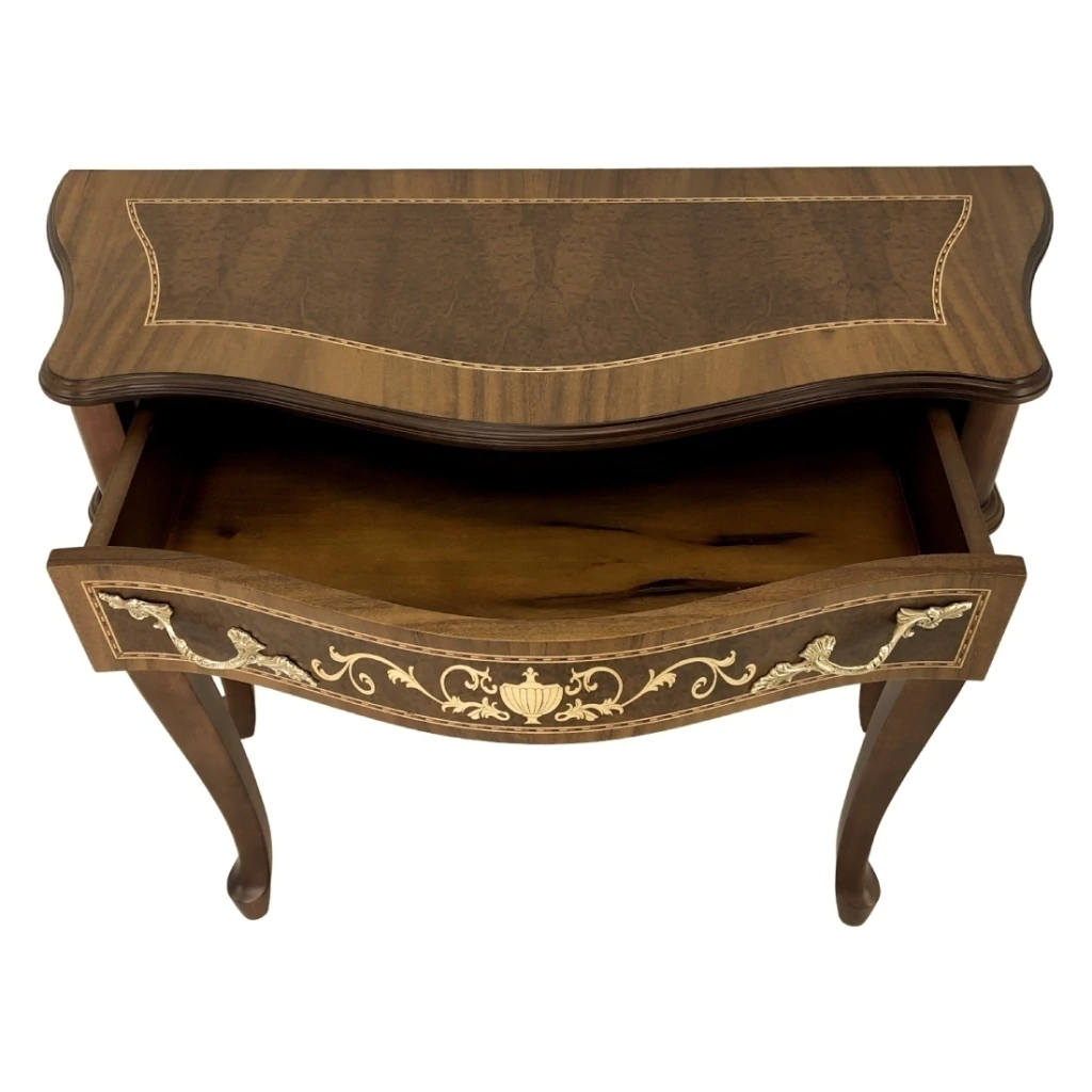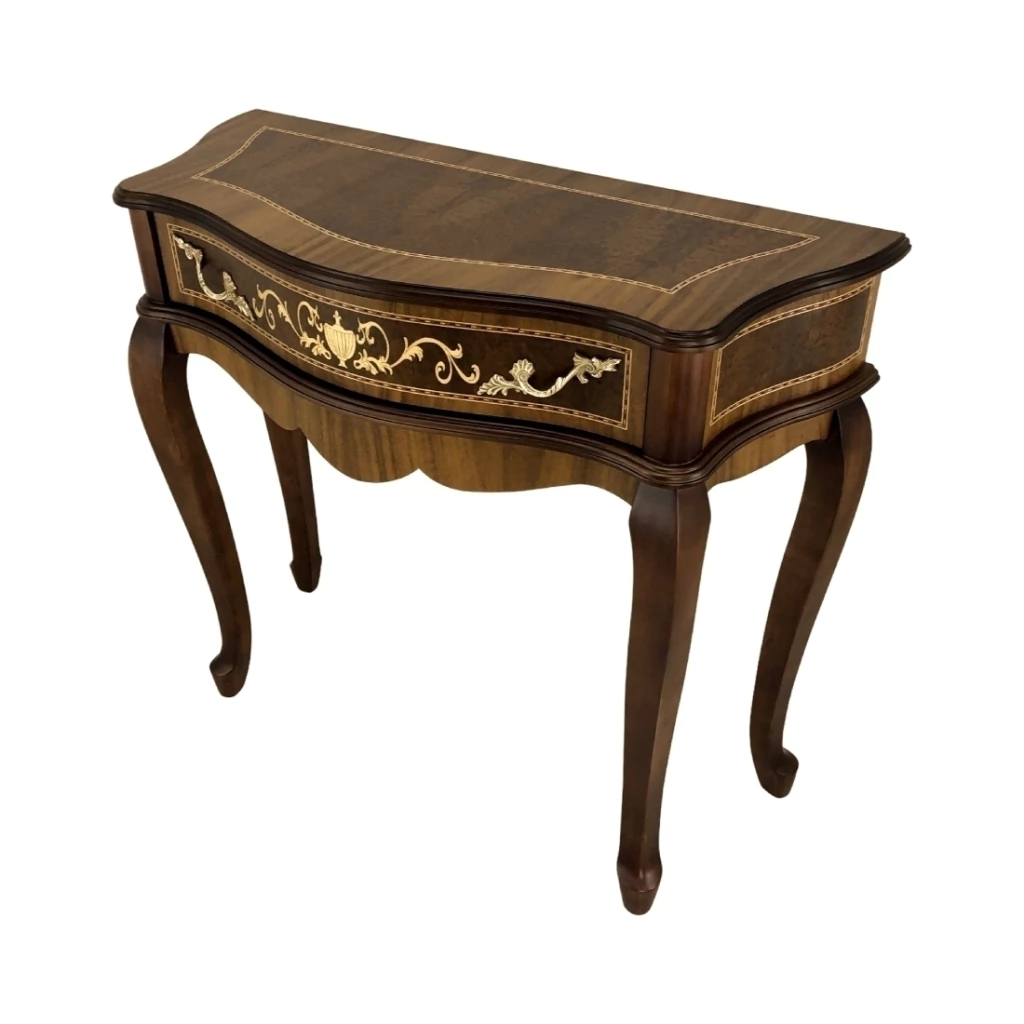Aparador com uma gaveta, estrutura em madeira maciça de jequitibá tingida de imbuia. A parte da marchetaria é feita com radica natural de imbuia. Ornamentos em metais dourado.