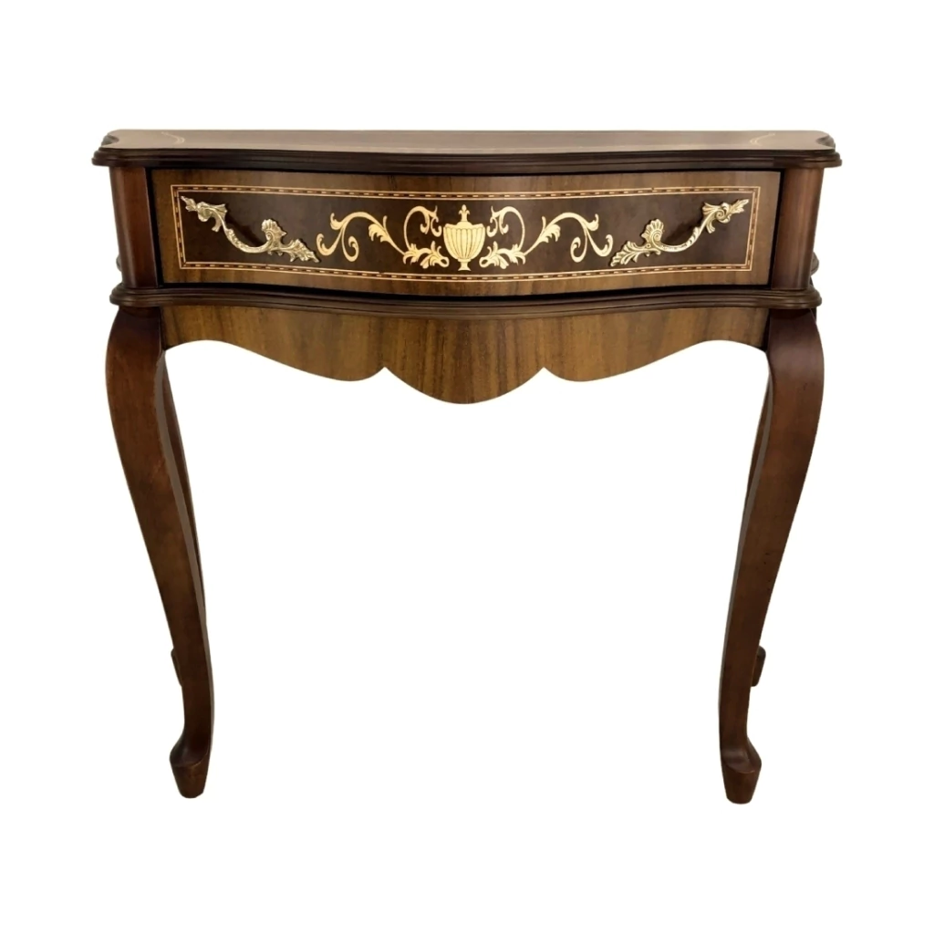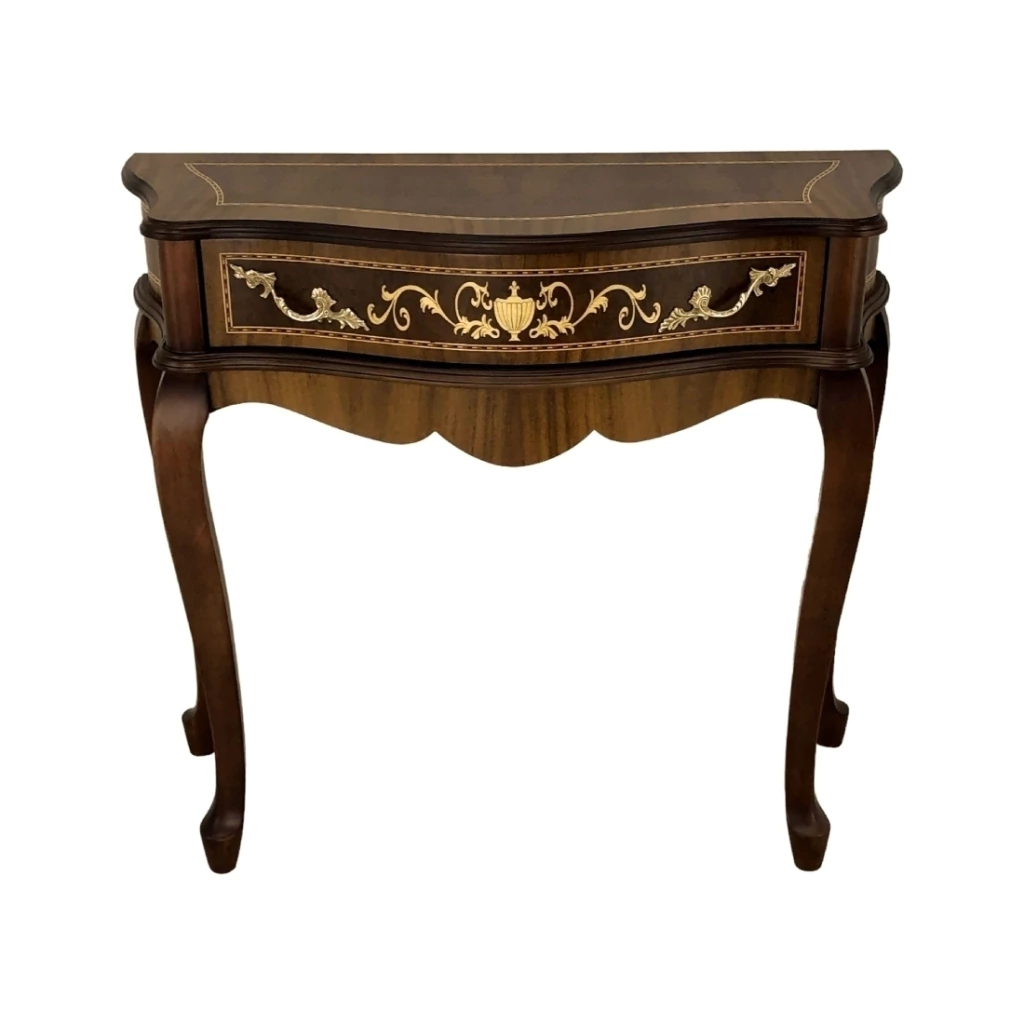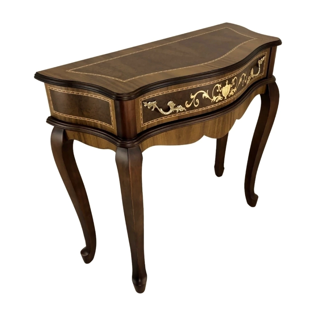 Aparador com uma gaveta, estrutura em madeira maciça de jequitibá tingida de imbuia. A parte da marchetaria é feita com radica natural de imbuia. Ornamentos em metais dourado.