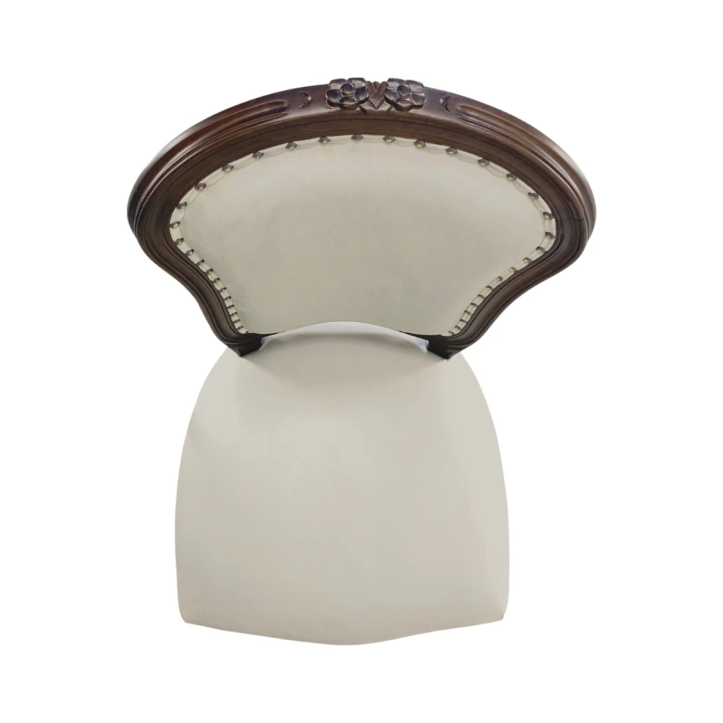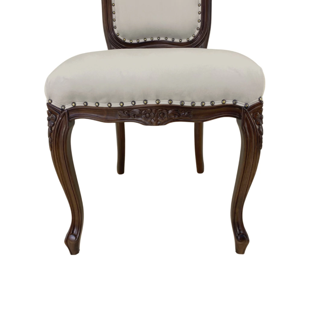 Cadeira com estrutura em madeira maciça de jequitibá tingida de imbuia. Entalhes na madeira feito a mão. Estofamento em veludo bege claro com tachas.