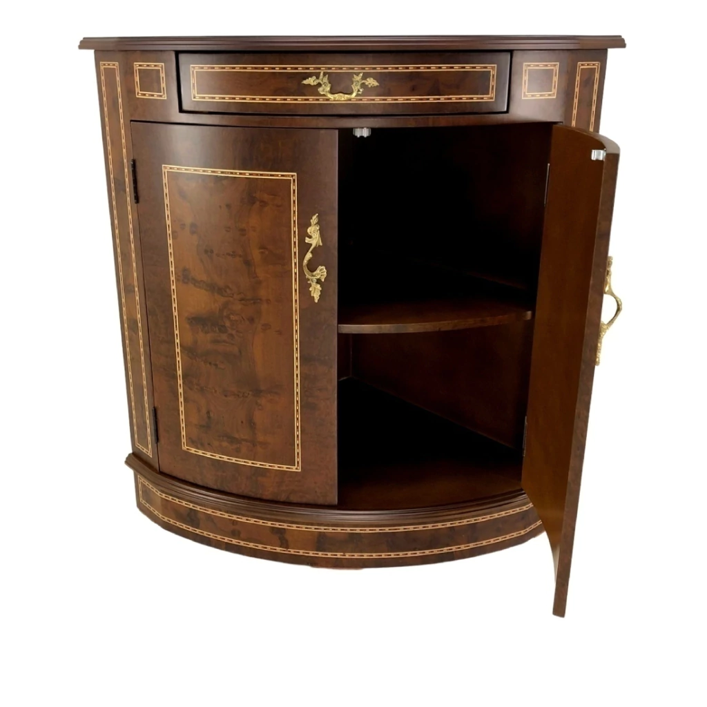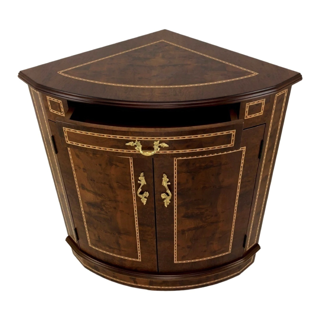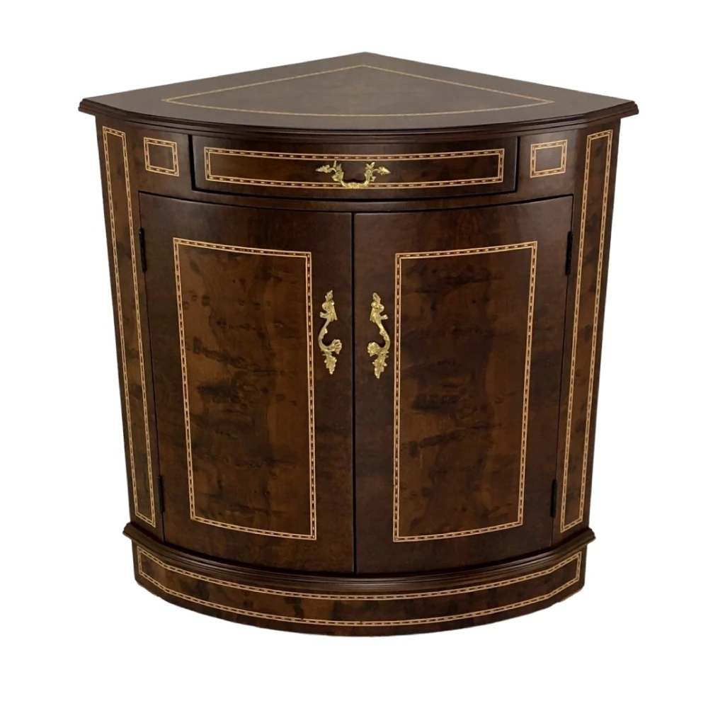 Cantoneira com uma gaveta e duas portas, estrutura em madeira maciça de jequitibá tingida de imbuia. A parte da marchetaria é feita com radica natural de imbuia. Ornamentos em metal dourado.