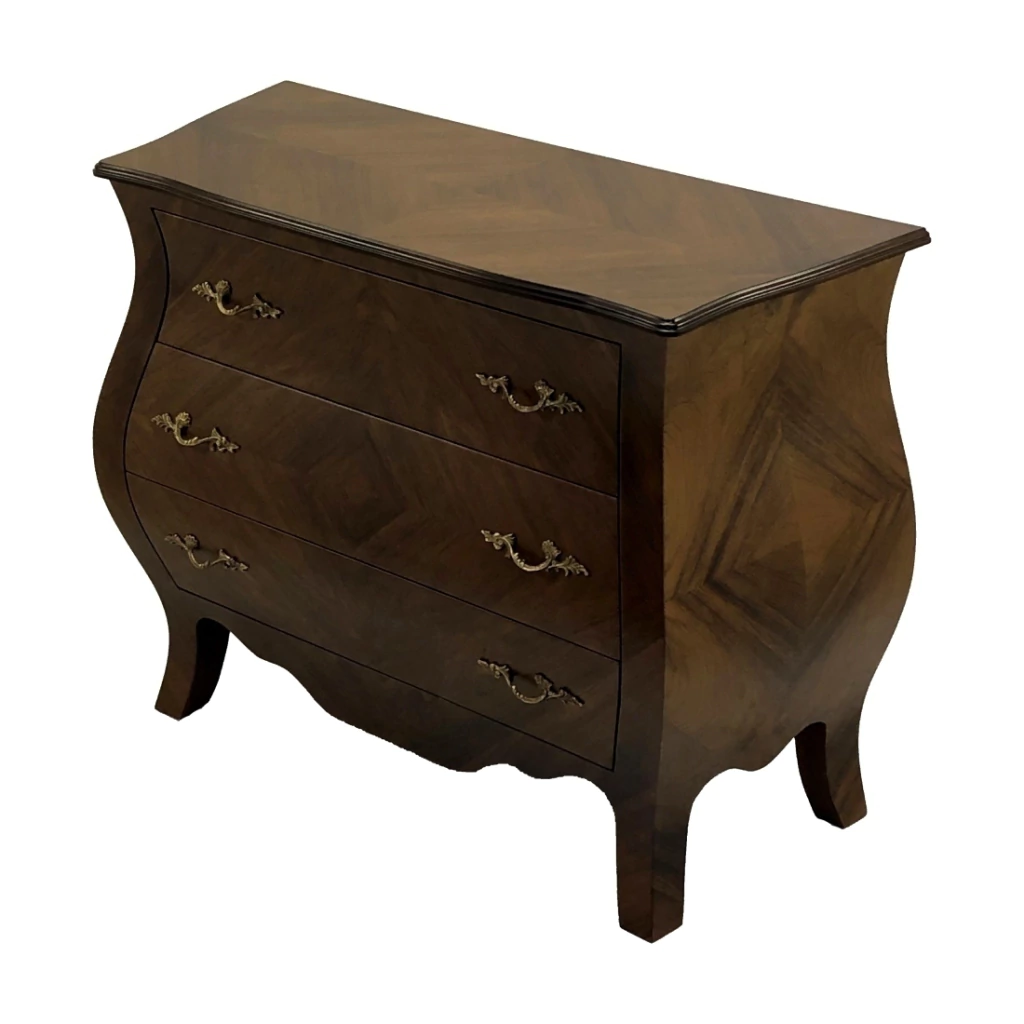 Cômoda bombê com três gavetas, estrutura em madeira maciça de jequitibá tingida de imbuia. A parte da marchetaria é feita com radica natural de imbuia. Ornamentos em metais dourado.