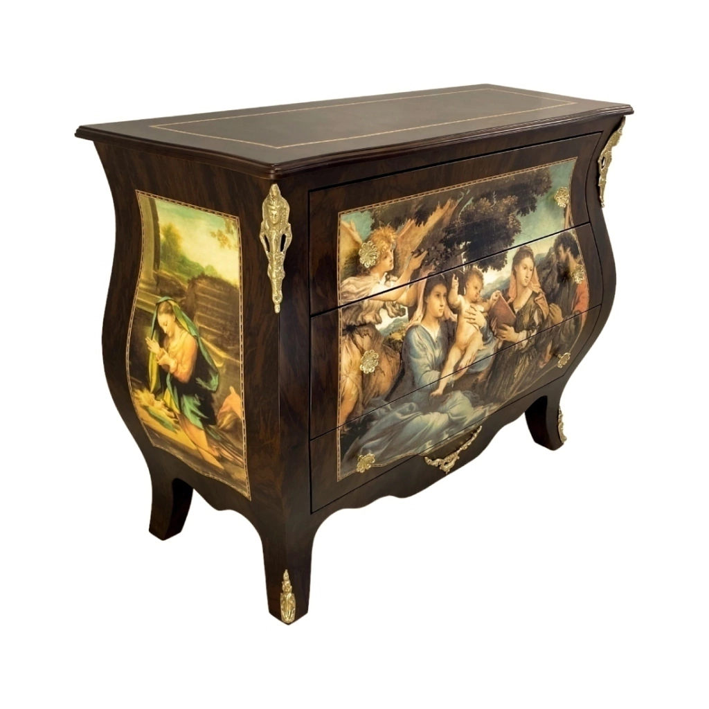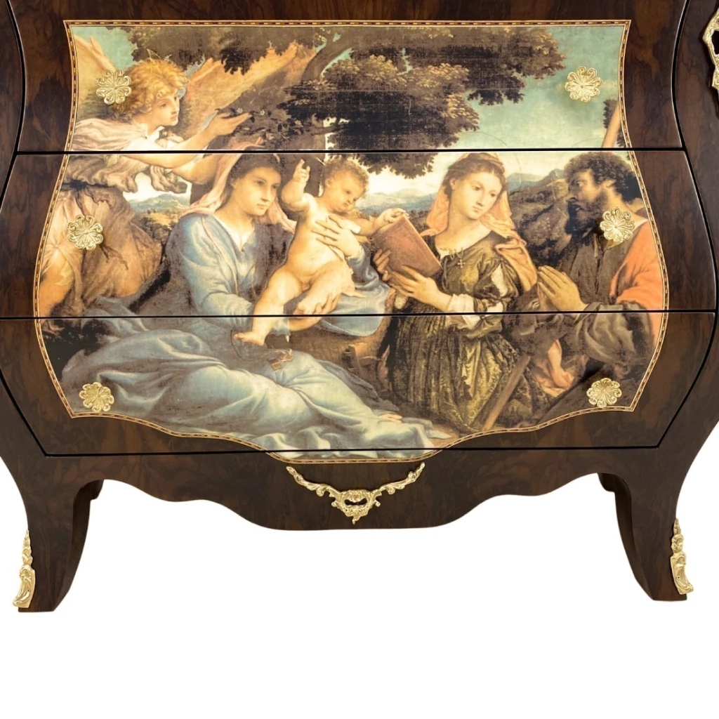 Cômoda bombê com gravura, três gavetas, estrutura em madeira maciça de jequitibá tingida de imbuia. A parte da marchetaria é feita com radica natural de imbuia. Ornamentos em metais dourado.