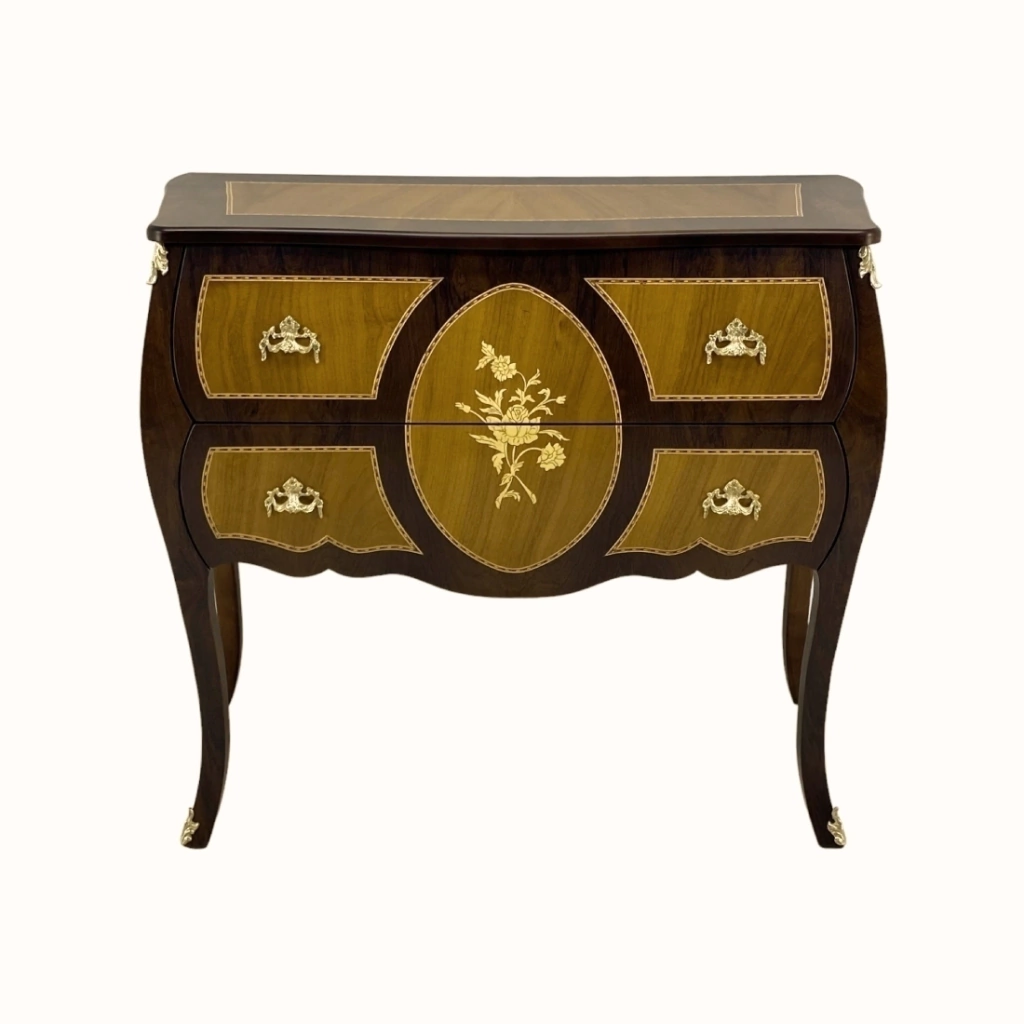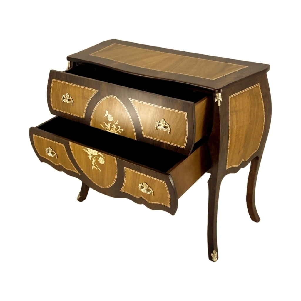 Cômoda com duas gavetas, estrutura em madeira maciça de jequitibá tingida de imbuia. A parte da marchetaria é feita com radica natural de imbuia. Ornamentos em metais dourado.