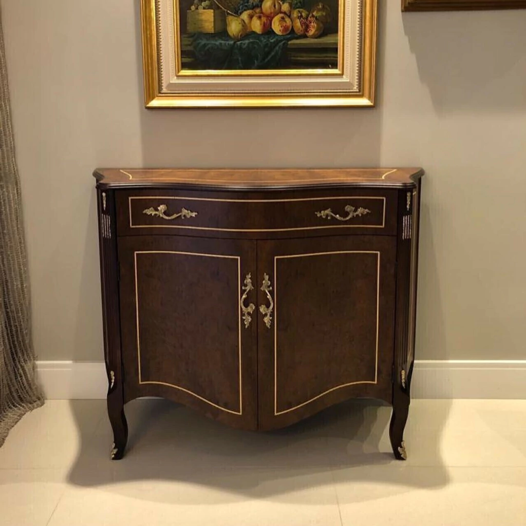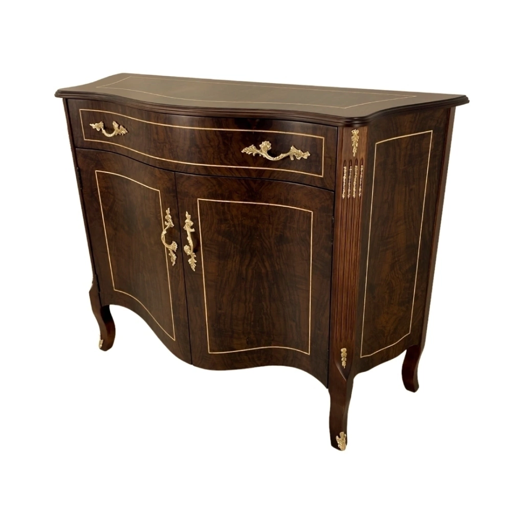 Balcão / Cômoda com uma gaveta, duas portas e uma prateleira de madeira, estrutura em madeira maciça de jequitibá tingida de imbuia. A parte da marchetaria é feita com radica natural de imbuia. Ornamentos em metais dourado.