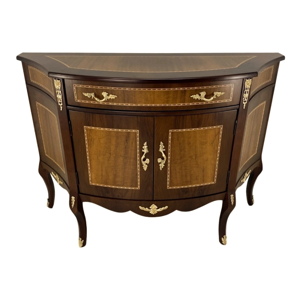 Cômoda com uma gaveta, duas portas, estrutura em madeira maciça de jequitibá tingida de imbuia. A parte da marchetaria é feita com radica natural de imbuia. Ornamentos em metais dourado.