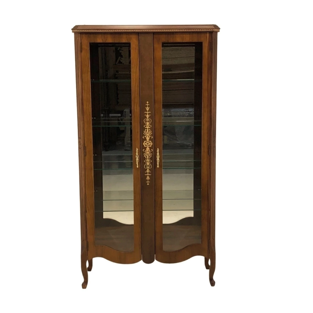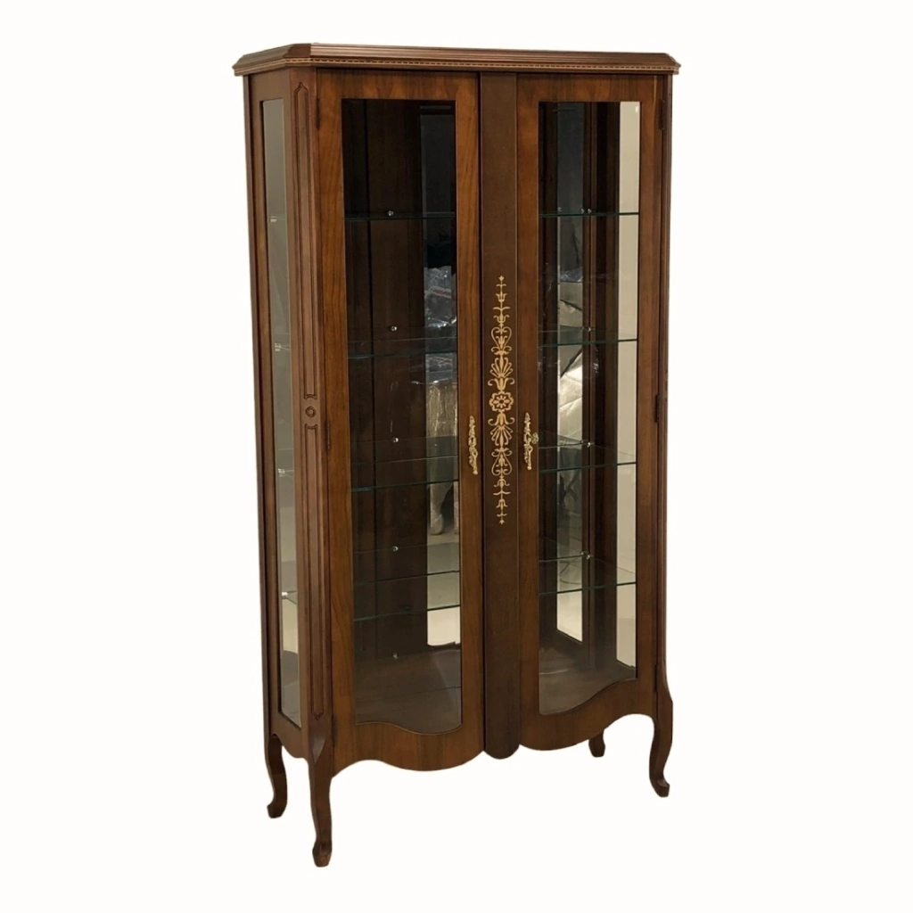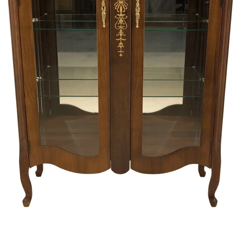 Cristaleira, estrutura em madeira maciça de jequitibá tingida de imbuia. A parte da marchetaria é feita com radica natural de imbuia. Ela possui iluminação em led quente, quatro prateleiras de vidro incolor de 6mm, espelho 3mm na parte do fundo, vidro incolor 4mm com bisote na porta da frente e laterais. Ornamentos em metais dourado.