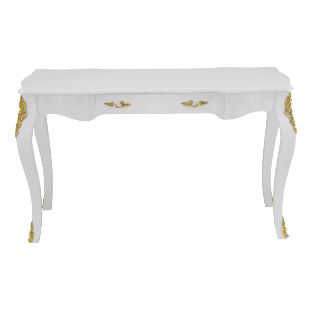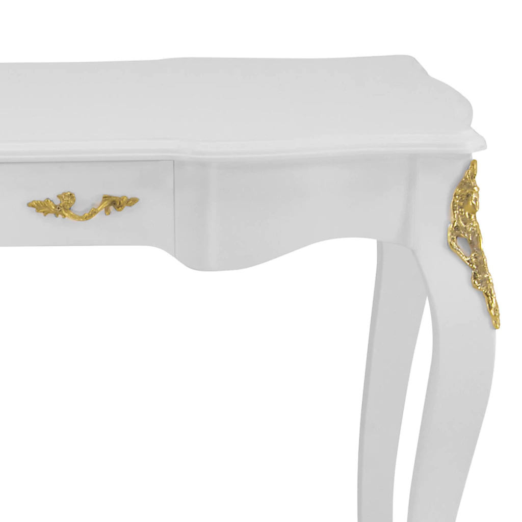 Escrivaninha com uma gaveta central, estrutura de madeira maciça de jequitibá, acabamento em laca branca fosca. Ornamentos em metal dourado.