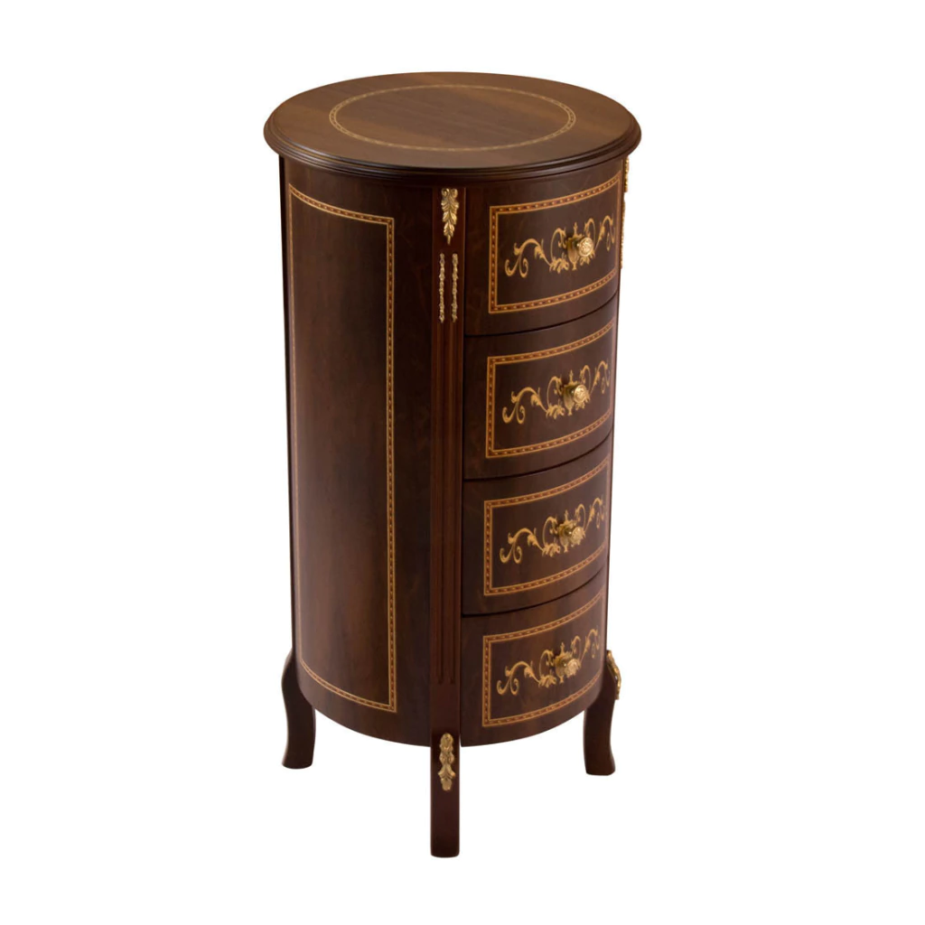 Mesa de apoio / lateral redonda com quatro gavetas, estrutura em madeira maciça de jequitibá tingida de imbuia. A parte da marchetaria é feita com radica natural de imbuia. Ornamentos em metais dourado.