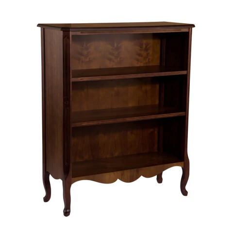 Livreiro com duas prateleiras de madeira, estrutura em madeira maciça de jequitibá tingida de imbuia. A parte da marchetaria é feita com radica natural de imbuia.