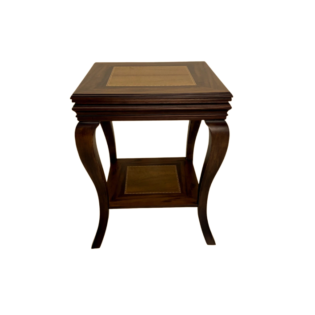 Mesa de apoio / lateral quadrada com prateleira, estrutura em madeira maciça de jequitibá tingida de imbuia. A parte da marchetaria é feita com radica natural de imbuia.