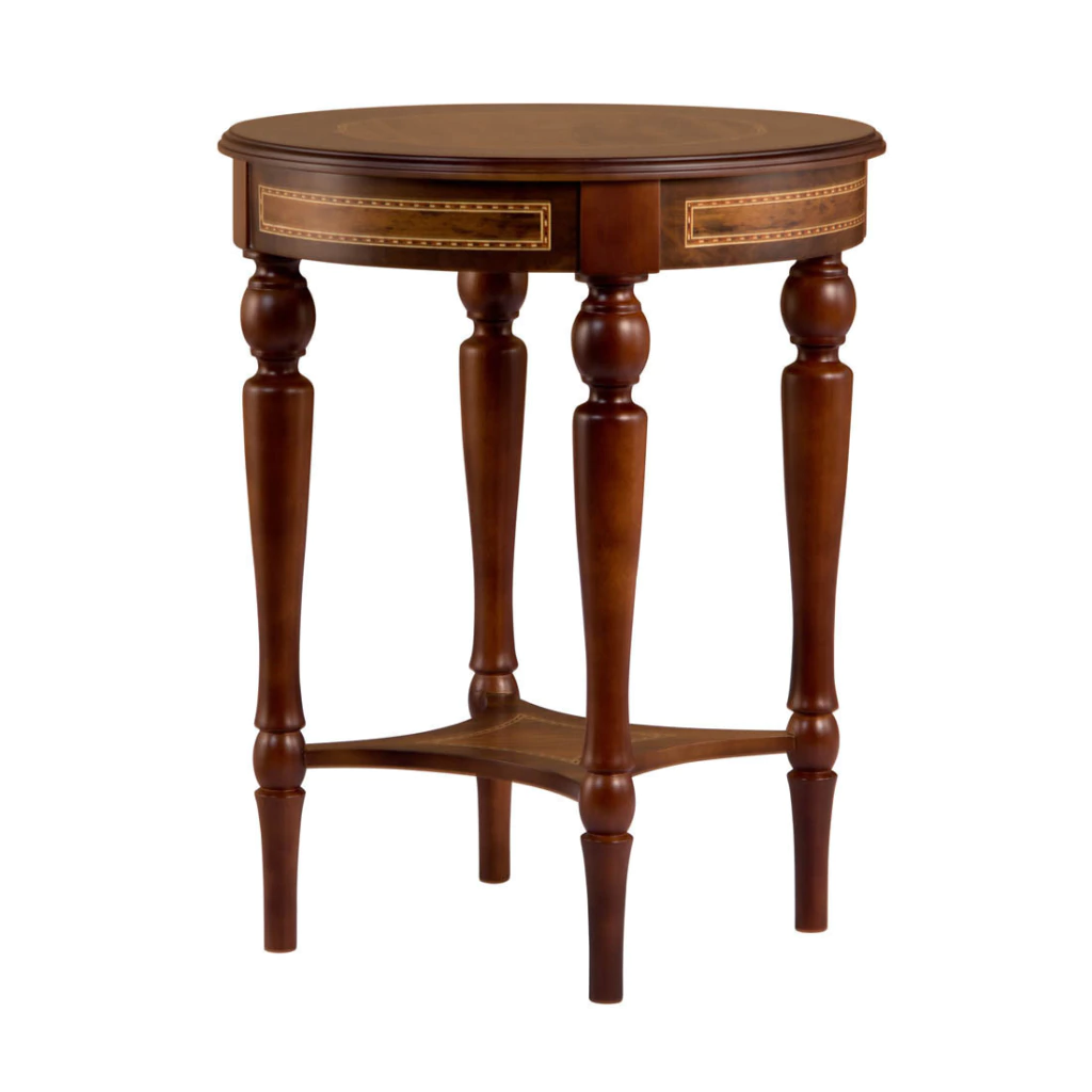 Mesa de apoio / lateral redonda, estrutura em madeira maciça de jequitibá tingida de imbuia. A parte da marchetaria é feita com radica natural de imbuia. Pés torneados.