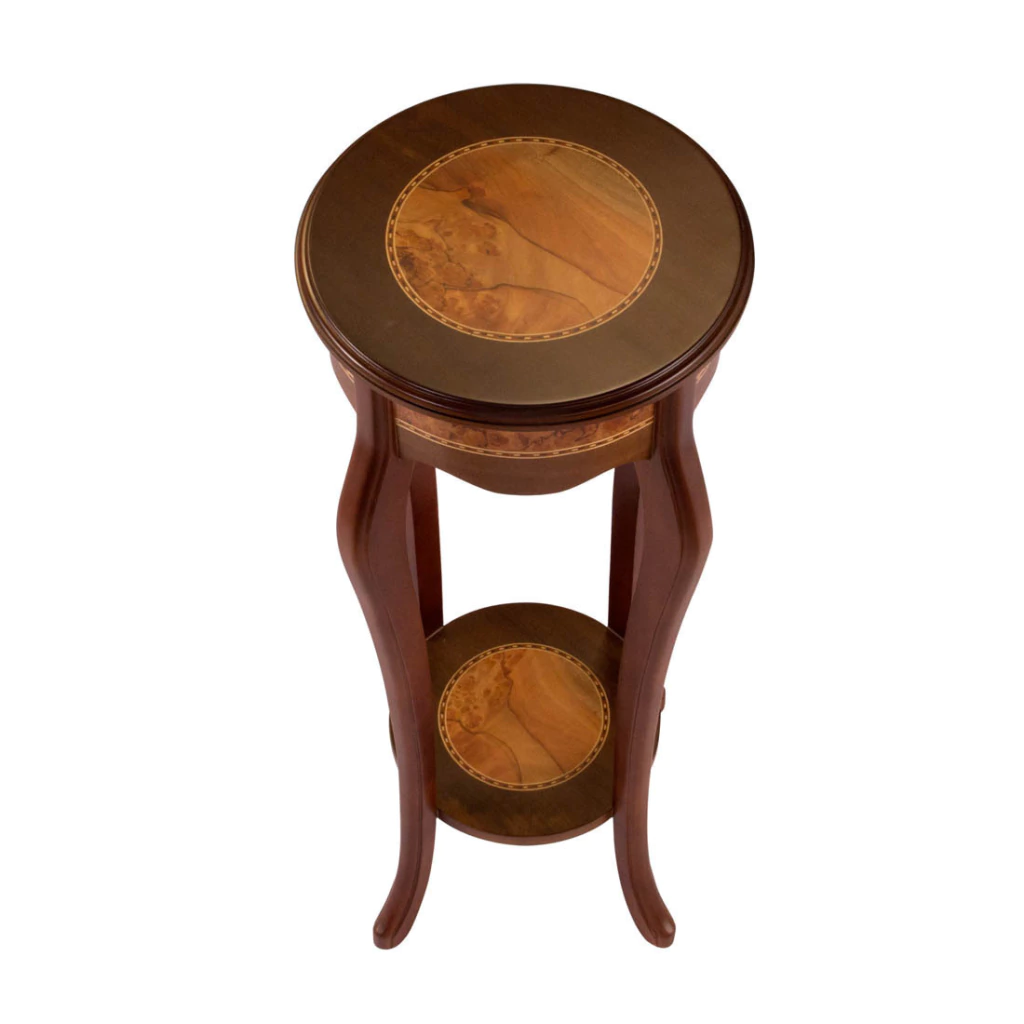 Mesa de apoio / lateral redonda, estrutura em madeira maciça de jequitibá tingida de imbuia. A parte da marchetaria é feita com radica natural de imbuia e pimenteira.
