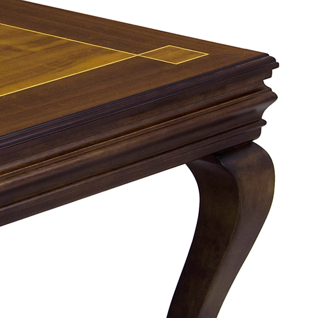 Mesa de apoio / lateral quadrada, estrutura em madeira maciça de jequitibá tingida de imbuia. A parte da marchetaria é feita com radica natural de imbuia.