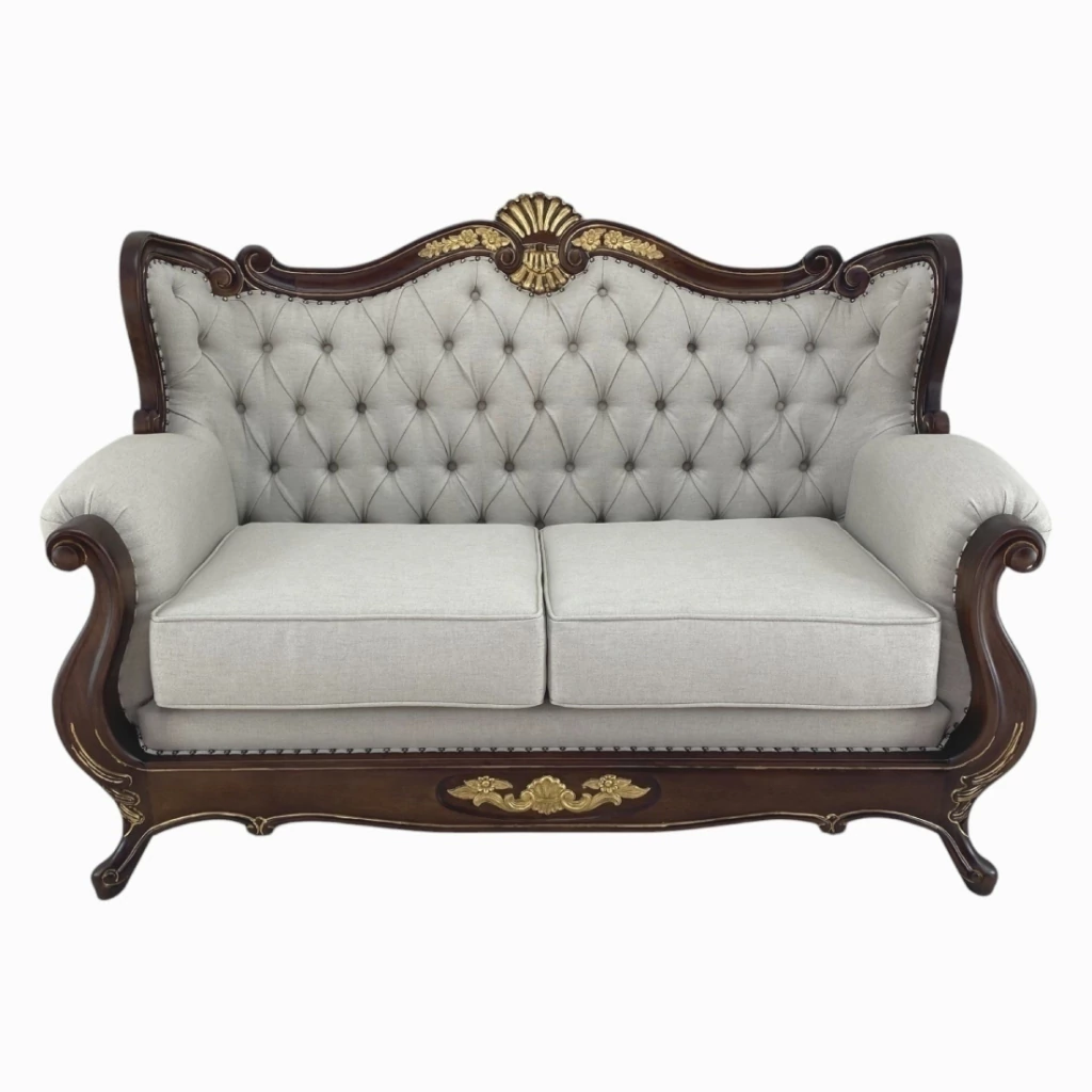 Sofá dois lugares, com estrutura em madeira maciça de jequitibá tingida de imbuia, entalhes direto na madeira feito a mão, detalhes em pó de ouro. Estofamento em linho acinzentado, com tachas e capitonê.